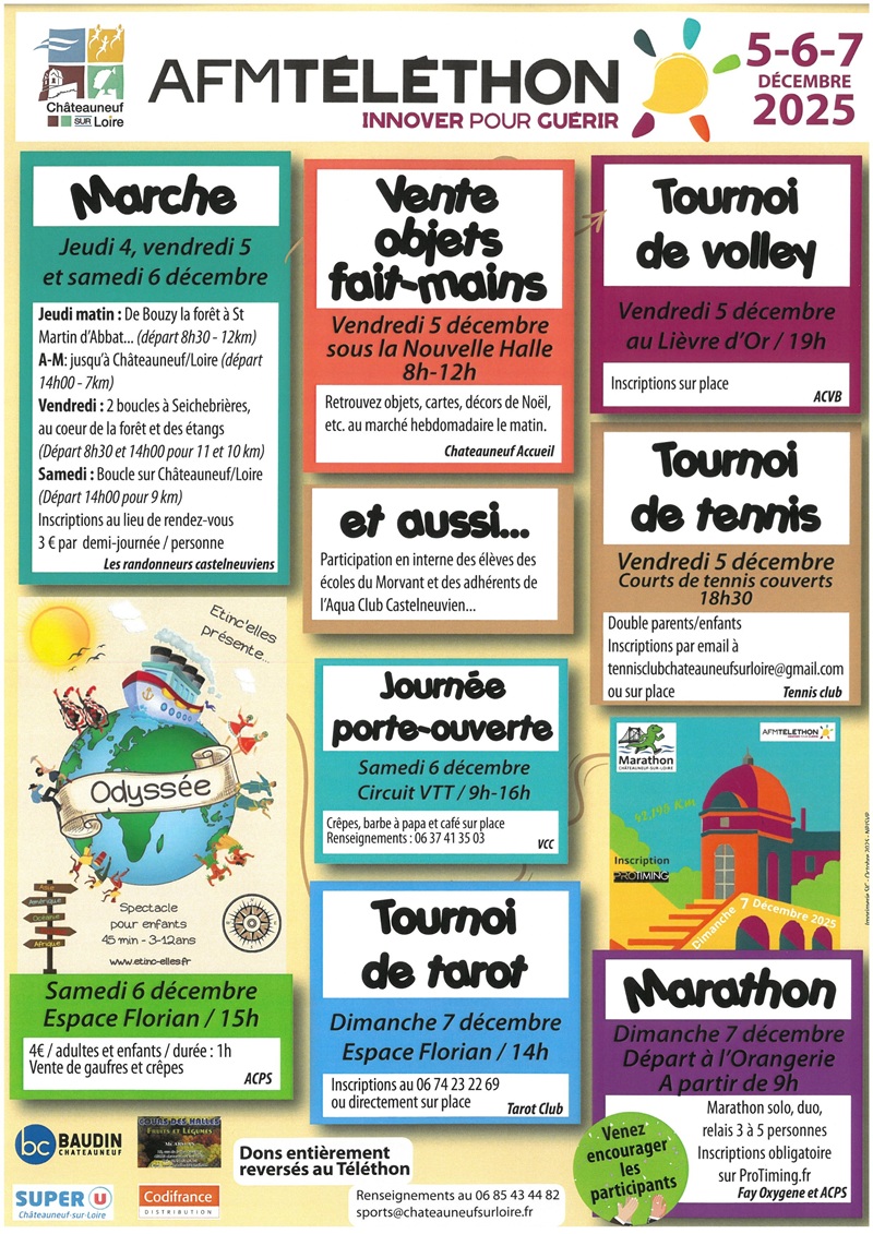Randonnée au pays de Châteauneuf : 50 km sur 3 jours avec des parcours inédits, possibilité de participer par journée ou demi-journée (participation 3€ minimum par demi-journée). Odyssée : spectacle pour les enfants de 3 à 12 ans. Vente d'objets faits main. Journée portes ouvertes au vélo club castelneuvien. Concours de tarot. Tournoi de volley et de tennis. Marathon de l'Espoir en solo, duo ou équipe. Tout le programme avec les détails sur le site internet.