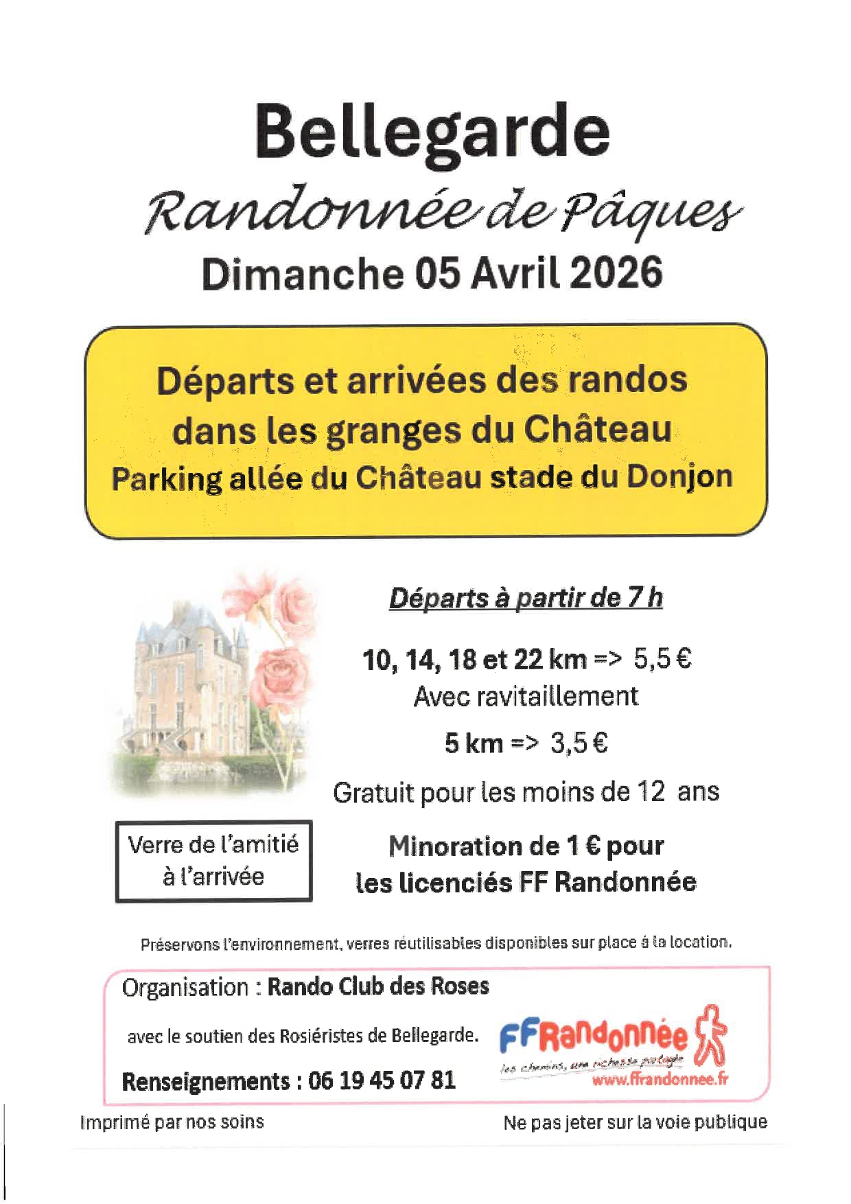 Randonnée pédestre de Pâques à l'occasion de la Foire aux Rosiers. Organisée par le Rando Club des Roses. Départ des granges du Château. Parcours : 22 -18 - 14 -10 et 5 kms. Pot de l'amitié à l'arrivée.