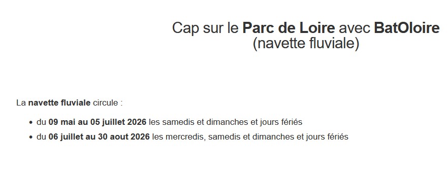 Ce service, reliant la rive droite et la rive gauche de la Loire, sera disponible du 9 mai au 30 août 2026, avec Balades en Bateau à Orléans. Durant cette période BatOLoire desservira 2 points : le «Cabinet Vert» (pour les horaires qui se terminent par 45) et rejoindra le Parc de Loire avec un point d’embarquement à l’Île Charlemagne (pour les horaires en heure pile 00). À l’aller ou au retour, la ligne IC vous permet également de faire la liaison entre le centre-ville d’Orléans et l’Île Charlemagne. BatOloire fonctionne : du 9 mai au 5 juillet 2026 les samedis et dimanches (11h45 à 18h), du 6 juillet au 30 aout 2026 les mercredis, samedis et dimanches et jours fériés (11h45 à 18h). La validation d’un titre de transport est obligatoire pour voyager à bord du BatOloire. La tarification TAO est appliquée .